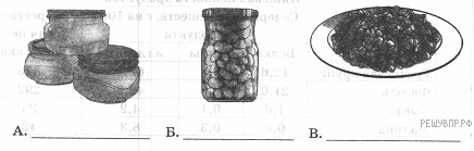 Чтобы выполнить это задание, нужно понять, что изображено на фотографиях. На картинке А — варенье из малины; Б — банка консервированной фасоли; В — гарнир из гречки.