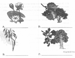 Ответ: A — кувшинка белая, Б — лещина обыкновенная, B - овёс посевной, Г — дуб черешчатый.