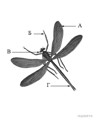 На рисунке буквами обозначены органы красотки темнокрылой. Запишите под каждой буквой в поле ответа номер соответствующего органа из представленного ниже списка.
