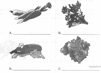 Ответ: A — морковь, Б— петрушка, В — кабачок, Г - салат.