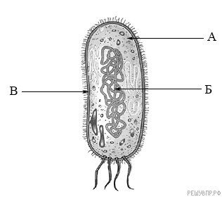 Ответ: А — цитоплазма; Б — хромосома ИЛИ генетический материал ИЛИ ДНК; В — оболочка.