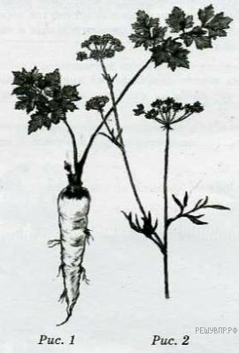 Покажите стрелками и подпишите на рисунках 1 и 2 стебель, лист, соцветие и корень петрушки огородной.