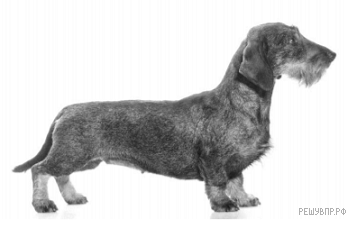 Рассмотрите фотографию собаки породы жесткошерстная такса и выполните задания. Выберите характеристики, соответствующие внешнему строению собаки, по следующему плану: окрас шерсти, форма ушей, форма хвоста.